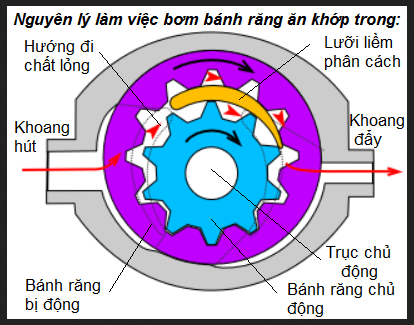 Theo nguyên lý bơm bánh răng, bánh răng chủ động và bánh răng bị động luôn đặt lệch tâm và quay cùng chiều trong stato.